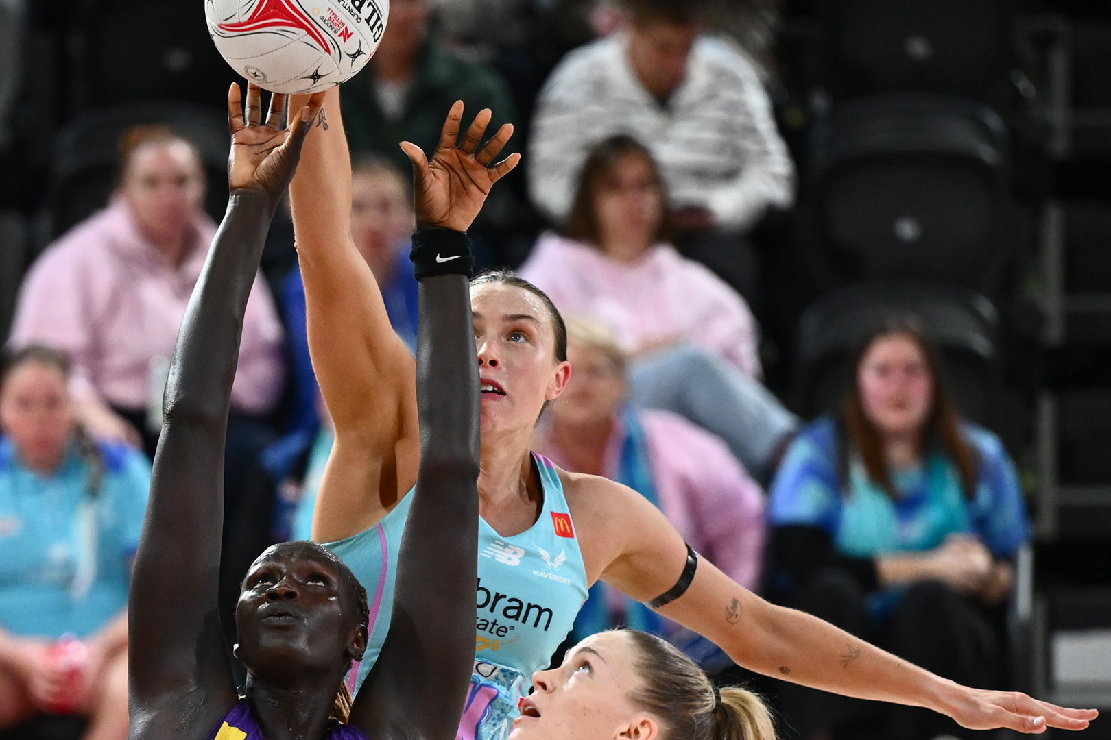 Lewis timed her jump perfectly against the Firebirds' sharpshooter.Against the 201cm goal shooter, that’s no easy feat.